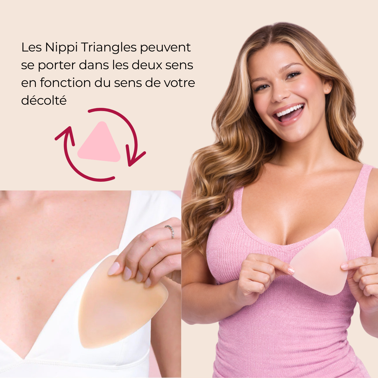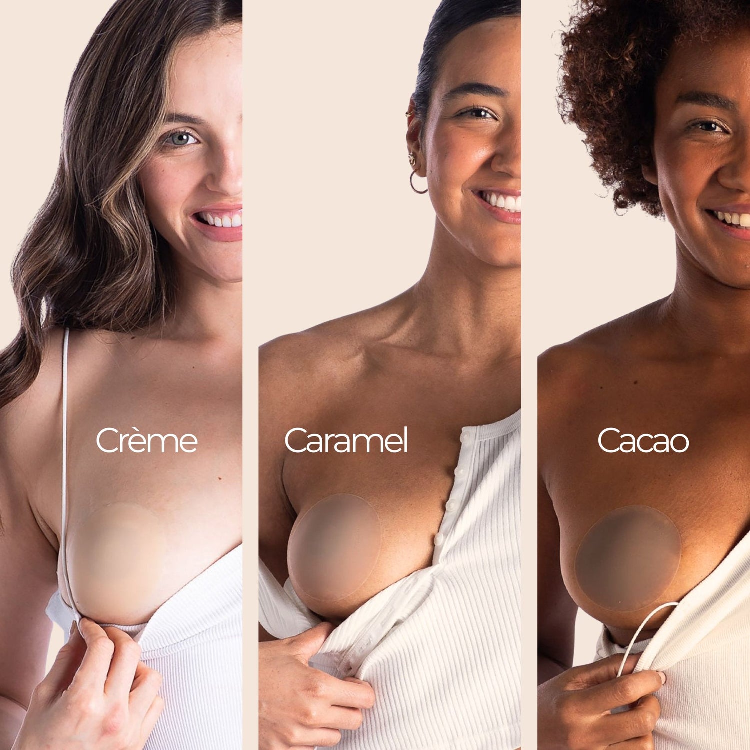 Alors, on a créé le premier cache-tétons qui couvre entièrement la poitrine, invisible, sans colle, ultra-confortable, qui adhère naturellement à la peau grâce à la chaleur corporelle.